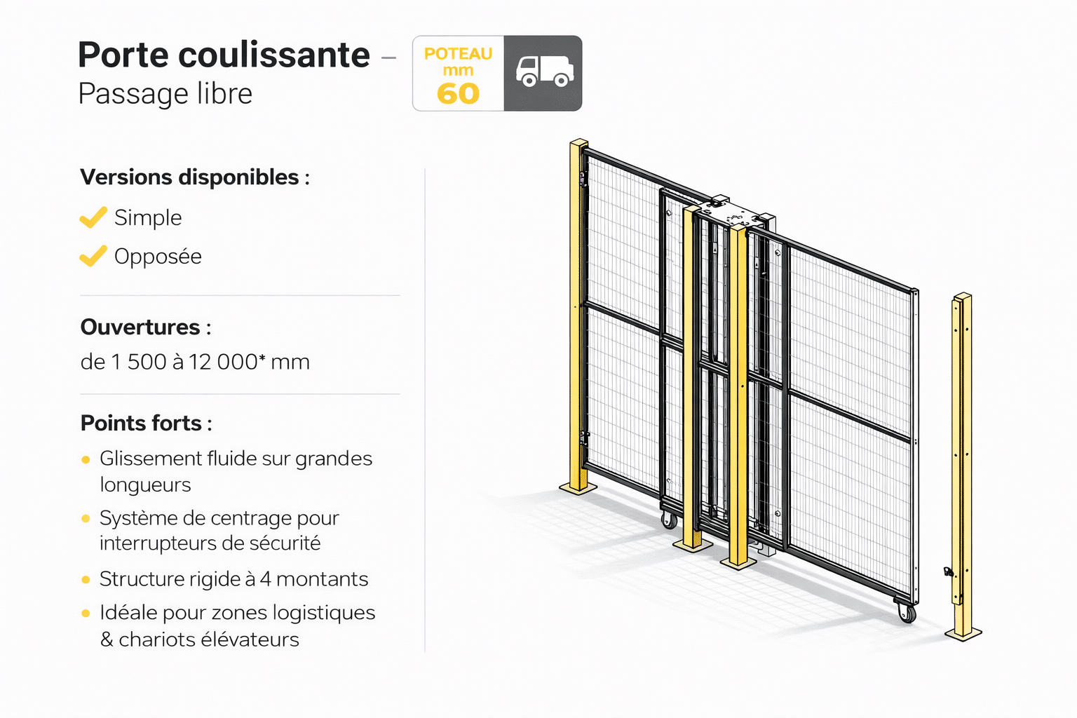 La porte coulissante passage libre est la solution idéale pour sécuriser des zones nécessitant de très larges ouvertures. Grâce à ses 4 montants, elle assure une rigidité maximale et une parfaite stabilité même sur des largeurs importantes.