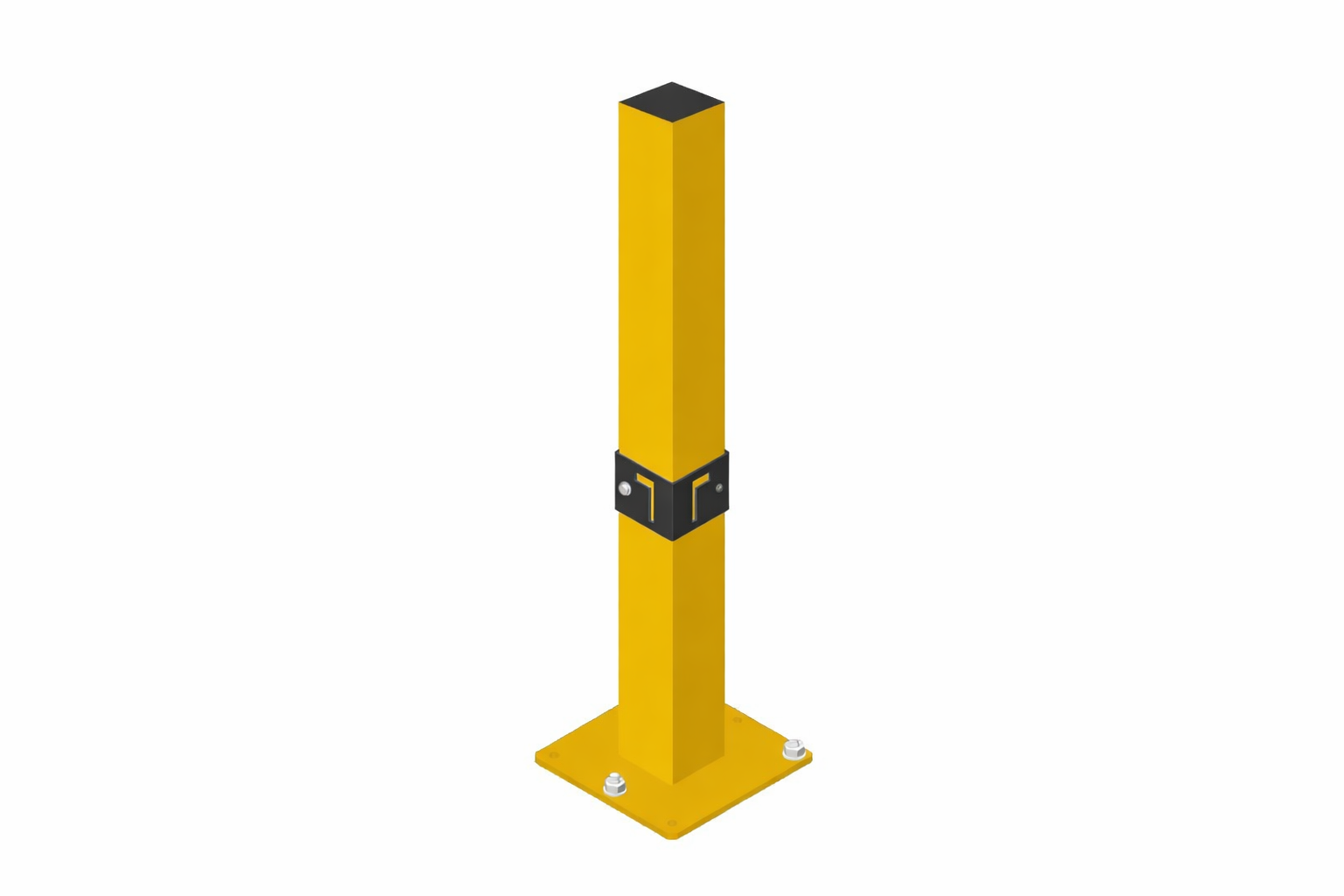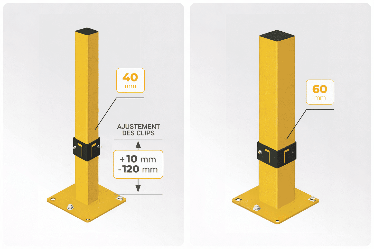 Poteau EasyGuard pour protections grillagées industrielles. Disponible en section 40x40mm avec base réglable ou 60x60mm avec base soudée 140×140mm.